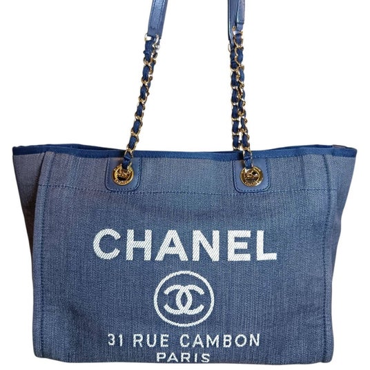 CHANEL ドーヴィルトート MM デニム トートバッグ A67001シャネル チェーン ゴールド金具 ネイビー ブラック 17番台 2013年 レディース ココマーク カンボン