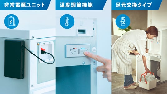 重い水ボトルを持ち上げずにセットできる足元交換タイプなので、どなたでも扱いやすいユニバーサルデザインとなっています。日常使いはもちろん、災害時の備えとしても取り入れやすい仕様です。