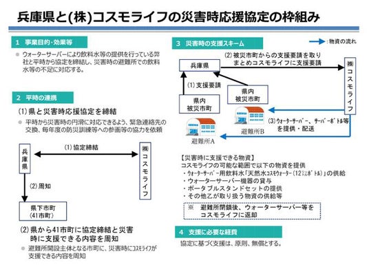 災害発生時には、被災市町から兵庫県を通じて支援要請を受け、当社がウォーターサーバーやサーバーボトル等を提供するスキームを定めています。