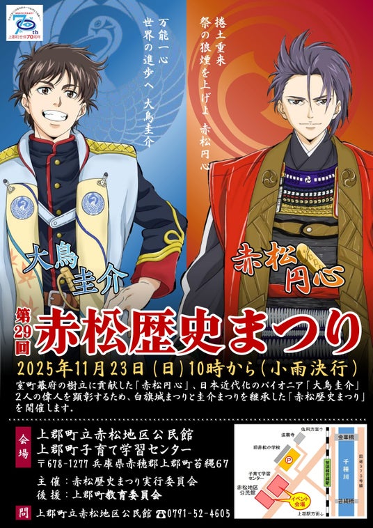 兵庫県上郡町では、令和7年11月23日(日)郷土の偉人「赤松円心」「大鳥圭介」が活躍した赤松地区を舞台に「赤松歴史まつり」を開催いたします。