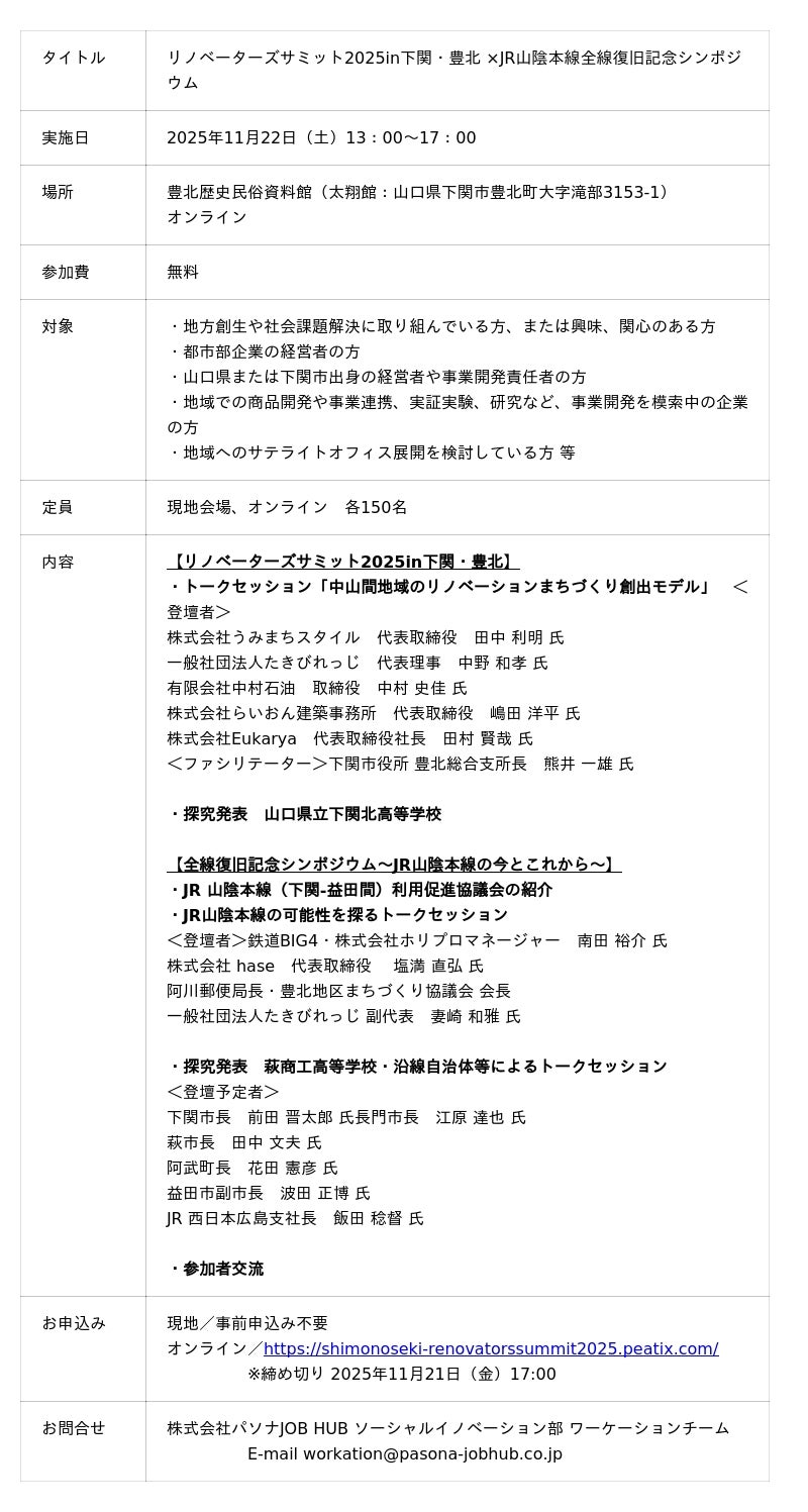 株式会社パソナJOB HUB(本社:東京都港区、代表取締役社長 高木 元義)は、山口県下関市から受託し実施する「令和7年度 豊北地域リノベーションまちづくり意識啓発業務」の一環として、豊北地域※1における新たな関係人口や地域と共創する事業開発プレイヤーの創出等を目的とした、事業共創ベント 『リノベーターズ※2サミット2025in下関・豊北』を11月22日(土)に、豊北歴史民俗資料館(太翔館:山口県下関市)とオンラインにて開催いたします。