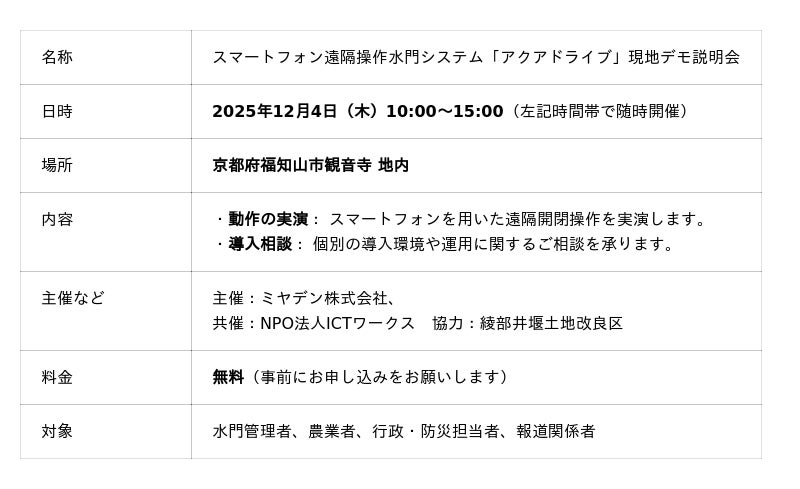 ミヤデン株式会社(京都府綾部市、代表取締役:長岡治明)は、水門の開閉をスマートフォンから遠隔操作できるIoT水門操作システム「アクアドライブ」(株式会社farmo製)の現地デモ説明会を2025年12月4日(木)に京都府福知山市にて開催します。