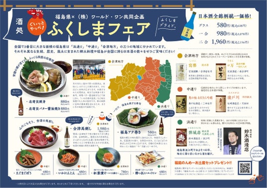 福島県は、神戸を中心に大阪・東京で郷土連携型の飲食店を展開する株式会社ワールド・ワン(本社:兵庫県神戸市、代表取締役:古里宣光)と連携し、福島の日本酒に焦点を当てた「ぐいっとやっぺ!酒処ふくしまフェア」を2025年11月12日(水)~11月25日(火)の期間、神戸・大阪の4店舗で開催します。