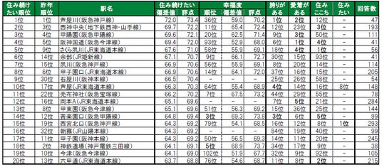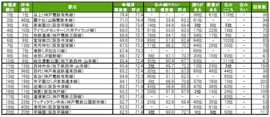 1位は、3年連続で芦屋市に位置する芦屋川で、唯一偏差値70台の高い評価を得ています。2位は神戸市西区に位置する西神中央(昨年3位)、3位は西宮市に位置する甲陽園(昨年4位)です。その他トップ10内では、6位余部(昨年14位)、7位夙川(昨年15位)、9位石屋川(昨年30位)、10位芦屋(昨年17位)が、昨年から順位を上げてトップ10入りしています。