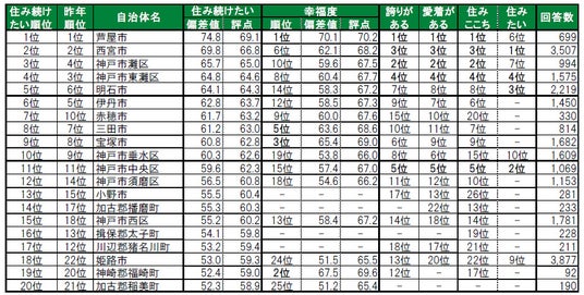 芦屋市が唯一偏差値70台の高い評価を得て、昨年3位から順位を上げて1位に輝きました。芦屋市は、他にも「住みここち」を含む4つのランキングで1位となっている街です。2位は、2年連続で神崎郡福崎町(かんざきぐん ふくさきちょう)です。3位は、昨年4位から一つ順位を上げた宝塚市です。トップ10内では、7位宍粟市(昨年19位)、9位赤穂市(昨年14位)、10位神戸市灘区(昨年12位)が、昨年から順位を上げてトップ10入りしています。