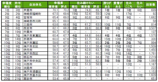 1位は5年連続で芦屋市で、唯一偏差値70台の高い評価を得ています。2位も、5年連続で西宮市です。3位は、昨年4位から一つ順位を上げた神戸市灘区です。