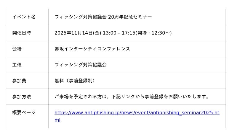 セキュリティ教育クラウド「セキュリオ」を提供するLRM株式会社(本社:兵庫県神戸市、代表取締役:幸松哲也)は、赤坂インターシティコンファレンスにて開催されるフィッシング対策協議会 20周年記念セミナーに参加いたします。