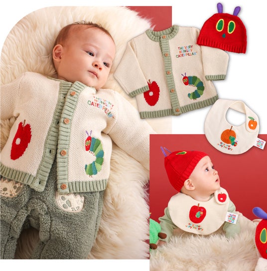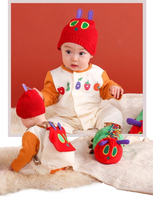 「はらぺこあおむし」になりきれるニット帽や、フルーツのサガラ刺繍がキュートなスタイを合わせれば絵本の世界から出てきたような愛らしい装いに。ベビーギフトにもピッタリです。