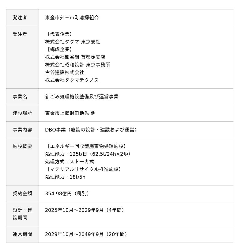 株式会社タクマ(本社:兵庫県尼崎市、社長:濱田州朗)を代表とする企業グループは、本年10月10日、千葉県東金市および大綱白里市、九十九里町、山武市(旧成東町)※1で構成される東金市外三市町清掃組合から、ごみ処理施設のDBO事業※2(以下「本事業」)を受注しました。本事業では、エネルギー回収型廃棄物処理施設およびマテリアルリサイクル推進施設を新設し、2029年10月から20年間の運営を行います。新ごみ処理施設では高効率排ガス処理システムを導入することにより、環境保全と経済性の両立を目指します。