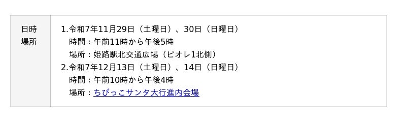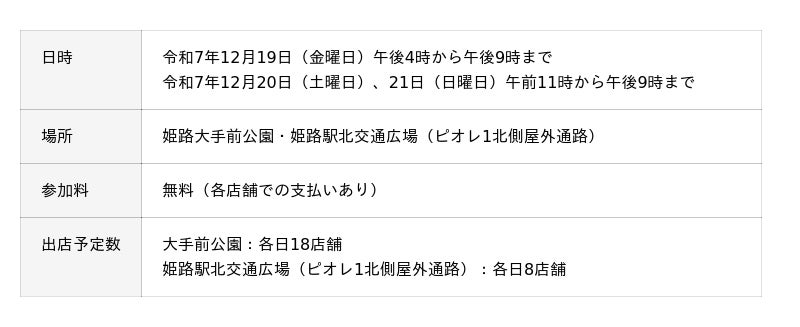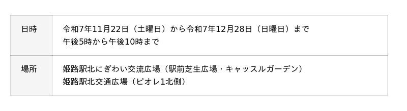 ピオレ姫路を運営するJR西日本アーバン開発株式会社との共同事業として、イルミネーションやクリスマスマーケット等を実施し、新たなクリスマスシーズンの雰囲気を姫路市中心市街地に醸成します。