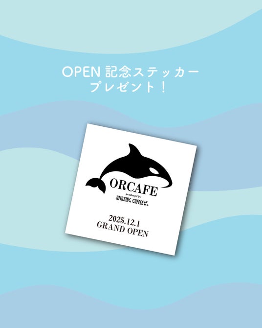 『ORCAFE produced by AMAZING COFFEE』は「AMAZING COFFEE」の福井県鯖江市、青森県に続く、コラボレーション店舗第三号店で、イベント出店で活躍していた大型キッチンカーの「バスくん」が神戸須磨シーワールドに常駐いたします。「AMAZING COFFEE」定番ドリンクはもちろん、限定のカフェチョコや、オルカ焼きなど、ORCAFE限定コラボメニューも販売いたします。さらに、オープンを記念しご来店のお客様にはORCAFEロゴデザインのオリジナルステッカーを期間限定でプレゼントいたします。