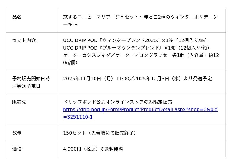 UCC上島珈琲株式会社(本社/兵庫県神戸市、資本金/10億円、社長/芝谷博司、以下UCC)は、“農園からこだわった、まっすぐな一杯”をお届けするカプセル式ドリップコーヒーシステム「ドリップポッド」より、コーヒーのテロワールを味わえる「旅するコーヒーマリアージュ」セットの第11弾を、11月10日(月)よりドリップポッド公式オンラインストアにて150セット限定で予約販売を開始します。今回は「旅するコーヒーマリアージュ」シリーズ初となる2種類のコーヒーと2種類のケーキを組み合わせたセットになっており、コーヒーはスペシャルティコーヒーを使用した『ウィンターブレンド2025』と、コーヒーの王様の名にふさわしい、品格のある味わいが特徴のブルーマウンテンコーヒーを使用した『ブルーマウンテンブレンド』を選定。ケーキにはポップアップストアなどで話題のパティスリー「feuquiage(フキアージュ)」が作る「ケーク・カシスフィグ」と「ケーク・マロングラッセ」とのマリアージュが楽しめます。