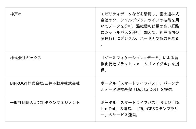 神戸市、株式会社ギックス(代表取締役CEO 網野 知博、以下「ギックス」)、BIPROGY株式会社(代表取締役社長 齊藤 昇、以下「BIPROGY」)、三井不動産株式会社(代表取締役社長 植田 俊、以下「三井不動産」)、一般社団法人UDCKタウンマネジメント(以下「UDCKタウンマネジメント」)は、都市OSの新たなユースケースとして、「スマートライフパス」、「Dot to Dot」を利用し、「渋滞解消」に向けた取り組みを実施します。