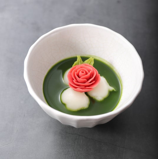 お客様ご自身で抹茶しるこを注いでいただき華やかな花抹茶しるこが完成します。餡で作った真っ赤な薔薇の花と抹茶しるこの緑のコントラストが美しく、心まで温まる味わいが楽しめる新しい和スイーツです。