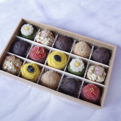 商品内容:フラワーおはぎ、創作おはぎ、定番おはぎを詰め合わせ15個入り