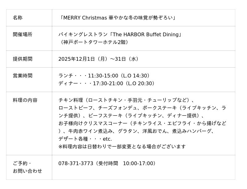 株式会社アベストコーポレーション(代表取締役:松山 みさお)が運営する神戸ポートタワーホテル(支配人:薩摩 利幸、兵庫県神戸市中央区)は、バイキングレストラン「The HARBOR Buffet Dining(ザ・ハーバー ビュッフェダイニング)」にて、2025年12月1日(月)から31日(水)まで、「MERRY Christmas 華やかな冬の味覚が勢ぞろい」を開催いたします。