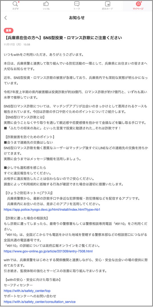 こうした継続的な安全対策に加え、警察庁や各都道府県警察、国民生活センターなどとの定期的な情報交換を実施しており、このたび千葉県警察、和歌山県警察、北海道警察に続き、兵庫県警察と連携して「with」「Omiai」ユーザーを対象にSNS型投資・ロマンス詐欺の手口や対策を紹介し、注意喚起を促す啓発活動の実施に至りました。