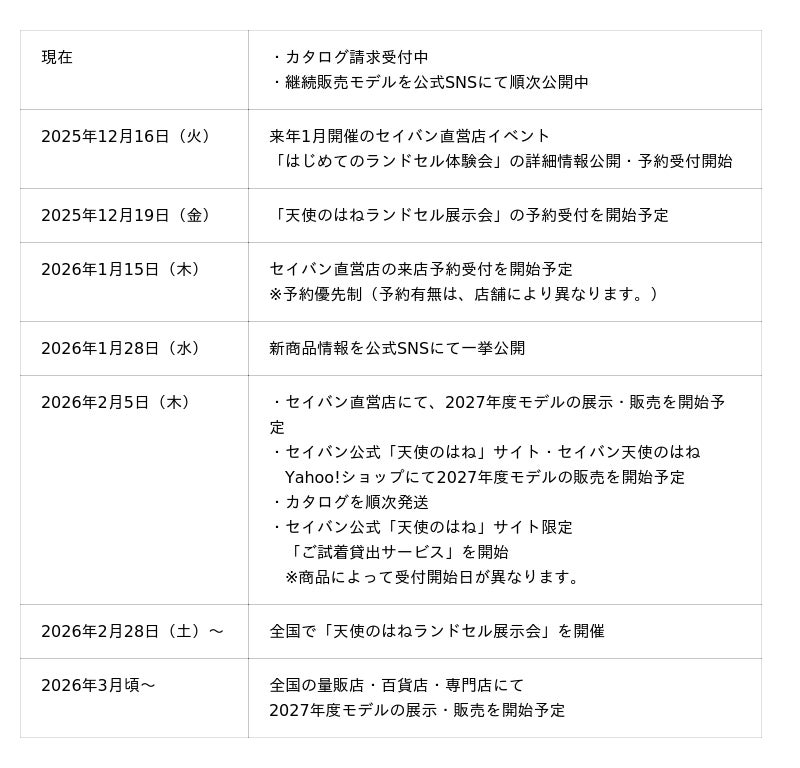 株式会社セイバン(本社:兵庫県たつの市、代表取締役社長:泉 貴章 以下「セイバン」)は、2025年12月11日(木)に、2027年度ご入学者さま向け「天使のはねランドセル」(以下「2027年度モデル」)の販売スケジュール・展示会情報を公開いたします。