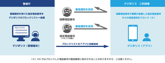 警視庁にて管理している指定電話番号がブロック対象に適時追加され、利用者自身での番号登録は不要。