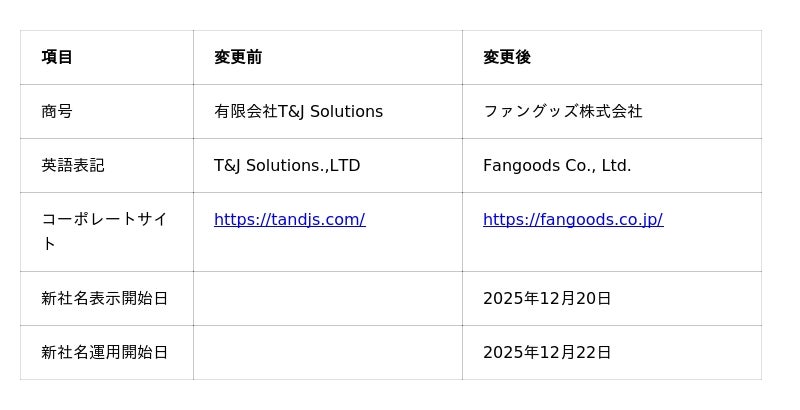 【社名】ファングッズ株式会社(旧:有限会社T&J Solutions)【所在地】兵庫県神戸市長田区西尻池町1丁目2-36 国栄ビル4F
