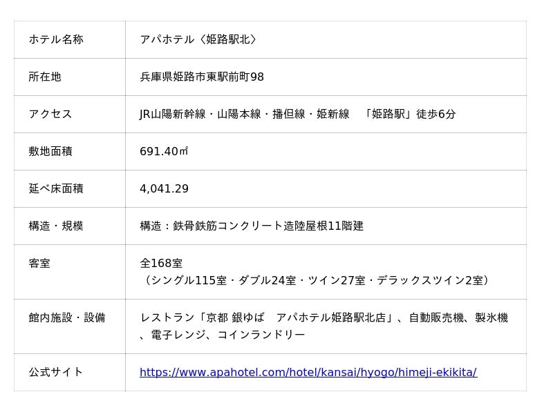 「アパホテル〈姫路駅北〉」は、姫路市の中心部に位置する新都市型ホテルです。山陽新幹線、JR山陽本線・播但線・姫新線「姫路駅」、山陽電鉄本線「山陽姫路駅」の2駅5路線が徒歩で利用可能で、ビジネス・観光双方において優れた交通利便性を備えています。世界文化遺産「姫路城」や、国際会議・コンサートなどが開催される大型複合施設「アクリエひめじ(姫路市文化コンベンションセンター)」も徒歩圏内にあり、姫路エリアにおけるビジネス需要に加え、観光・インバウンド・イベント関連需要の取り込みを図ります。客室はシングル、セミダブル、ダブル、ツイン、デラックスツインまで幅広くラインアップし、多様な宿泊ニーズに対応します。