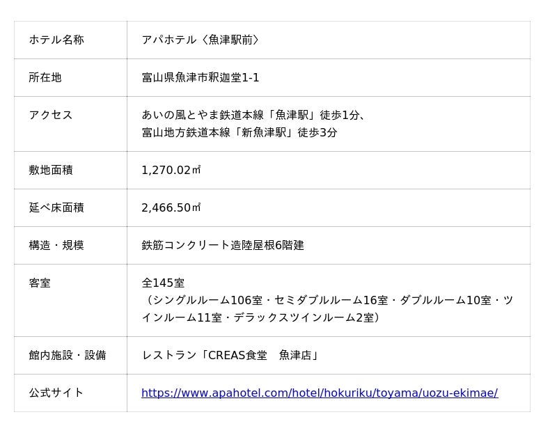 「アパホテル〈魚津駅前〉」は、あいの風とやま鉄道「魚津駅」から徒歩1分の新都市型ホテルです。富山方面・黒部方面いずれへのアクセスにも優れ、周辺に工場や事業所が集積する魚津エリアの特性を背景に、ビジネス利用に適した施設です。また、立山黒部アルペンルートの玄関口として、北陸新幹線の延伸による関西方面からのアクセス向上を背景に、観光・レジャー利用の滞在拠点としても幅広い需要が期待されます。客室はシングルを中心にダブル、ツイン、デラックスツインの4つの客室タイプを備え、機能性と快適性を両立した空間でお迎えいたします。