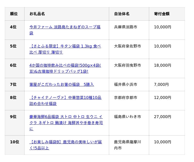 TOPIC 2 ランキングTOP10のうち8件が寄付金額1万円台、食品以外にユニークな「福袋」も紹介!