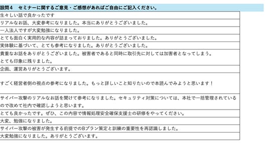 参加者からのコメントには、「サイバー攻撃の被害が発生する前提でのBCPプラン策定と訓練の重要性を再認識しました」 、「被害者であると同時に取引先に対しては加害者となってしまう」 といった声があり、今回の講演が、単なる技術的な対策に留まらない、事業継続計画(BCP)やサプライチェーン全体におけるリスクの再認識を促す機会となったことが示唆されます。