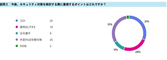 今後セキュリティ対策を検討する際に重視するポイントとしては、「コスト」と「外部からの攻撃対策」が同率で最も多く挙げられました 。・外部からの攻撃対策: 25件(26%)