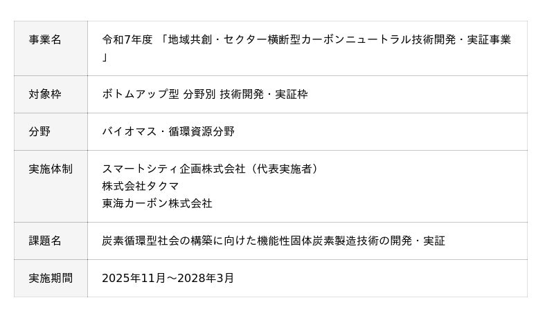 スマートシティ企画株式会社(代表取締役:石垣祥次郎、以下「スマートシティ企画」)、株式会社タクマ(代表取締役社長:濱田州朗、以下「タクマ」)、東海カーボン株式会社(代表取締役社長:長坂一、以下「東海カーボン」)の3社で実施する「炭素循環型社会の構築に向けた機能性固体炭素製造技術の開発・実証」(以下「本実証」)が、環境省が公募した令和7年度「地域共創・セクター横断型カーボンニュートラル技術開発・実証事業」に採択されました※1。