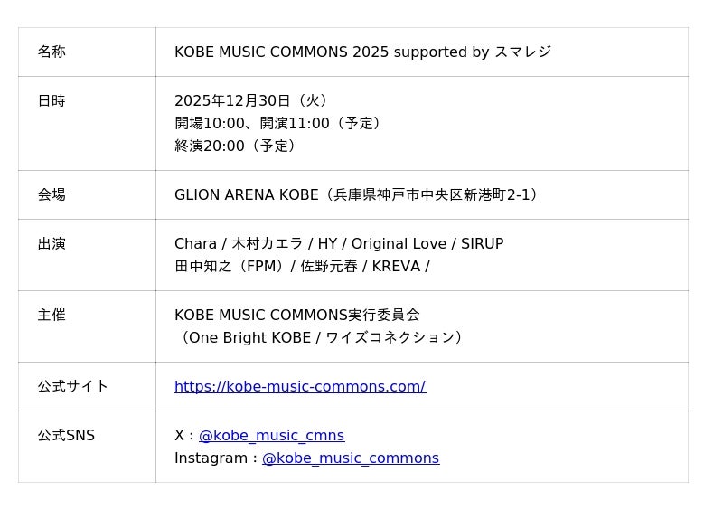 iPadなどのタブレットを利用したクラウドPOSレジ『スマレジ』を展開する株式会社スマレジ(本社:大阪市中央区、代表取締役:宮崎 龍平、以下「当社」)は、神戸ウォーターフロントに開業したGLION ARENA KOBEにて、12月30日(火)に開催される新たな音楽イベント「KOBE MUSIC COMMONS 2025 supported by スマレジ」にプラチナスポンサーとして協賛いたします。