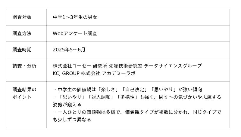 自分の内面世界への気づきが始まる中学生世代※が何を大切に感じているのか、また自分自身をどのように捉えているのかについて探求することで、今後の教育やキャリア支援をサポートする一助となるのではないかと考え、株式会社コーセーの研究所と共同研究を行いました。その結果、中学生は「楽しさ」や「自己決定」の価値観が強い傾向にあり、自尊感情を育むためには、「楽しい」「自分で決める」という体験を重ねることが重要であると示唆されました。