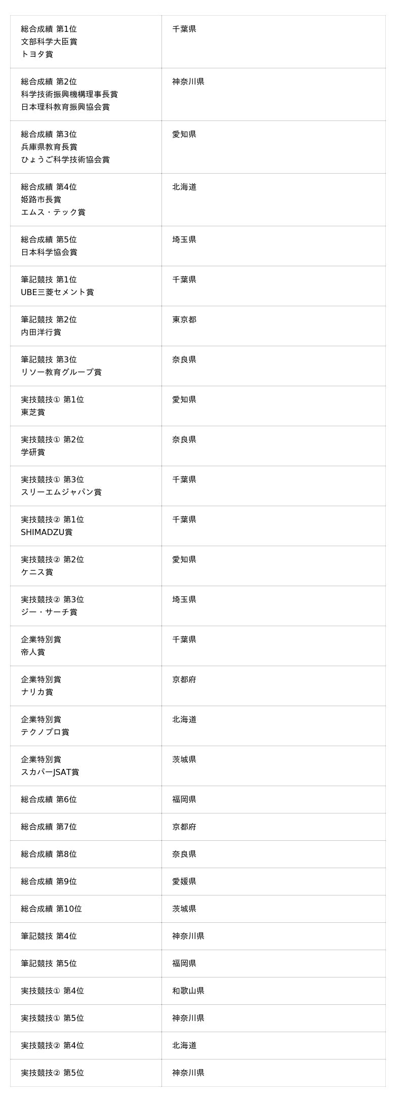 筆記競技、実技競技2種目の得点を合計した総合成績により、千葉県代表チームが優勝、神奈川県代表チームが第2位、愛知県代表チームが第3位となりました。そのほか、産学官の連携による科学技術系人材育成を推進する企業賞を含む、全ての成績については別紙をご参照ください。