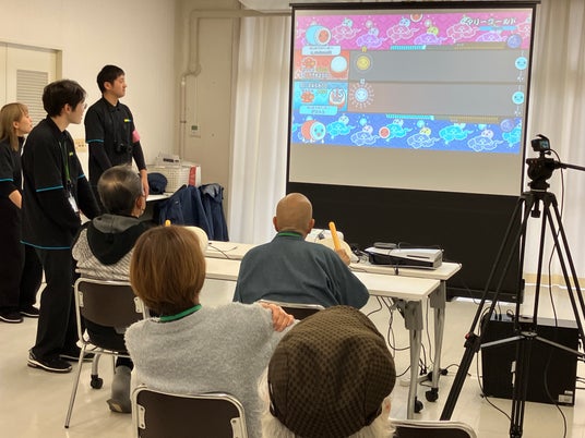 今回のイベントでは、老若男女問わず誰でも楽しめるリズムゲームを採用し、参加者が音楽に合わせて和太鼓を叩くという簡単な操作で楽しめる内容となっています。各会場でゲームを行うだけでなく、両団地を結ぶオンラインシステムを活用し、物理的な距離を超えてイベントを一緒に行いました。