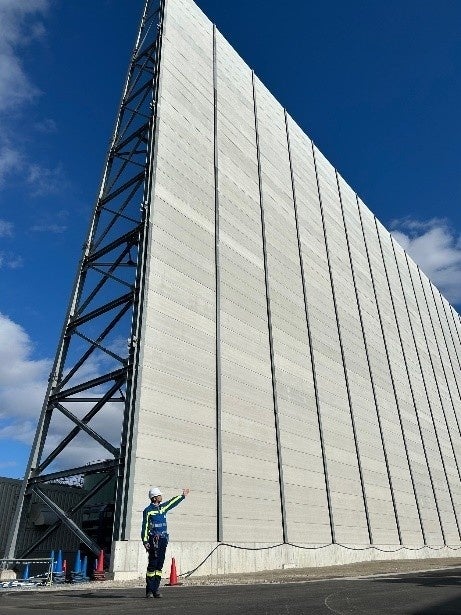 ■地域環境への配慮:高さ40mの防音壁設置 本発電所の建設にあたっては、計画段階から周辺環境への配慮に努めてきました。ガスタービンや蒸気タービン等の主要な設備は、吸音パネルを設置したタービン建屋内に収めています。加えて、敷地北側には高さ約40mの防音壁を設置し、近隣地域に対する防音対策を講じています。