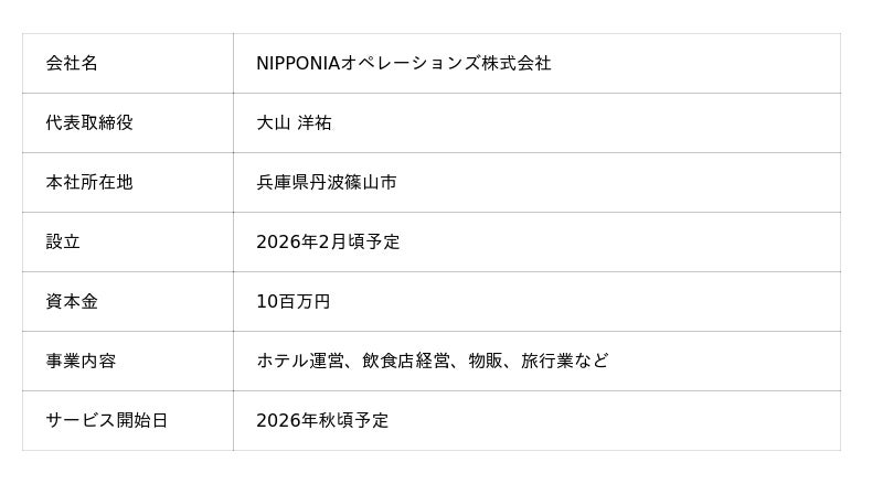 NOPは、2026年2月頃に設立、同年秋頃より一部のNIPPONIA施設の運営を開始する予定です。