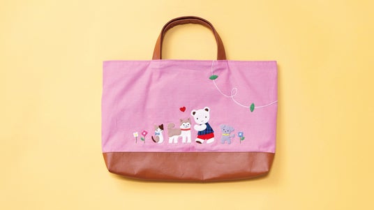 両面でストーリーがつながるバイカラーのデニムバッグ。第1話となるブルーの面では、クマちゃんのお誕生日のお祝いにやってきたお友達の様子を表現しています。第2話となるピンクの面では、お友達と一緒にお花畑でお散歩をしている様子を表現しました。合成皮革部分はピンクとブルーと調和するブラウンを選び、お花畑の土に見立てています。