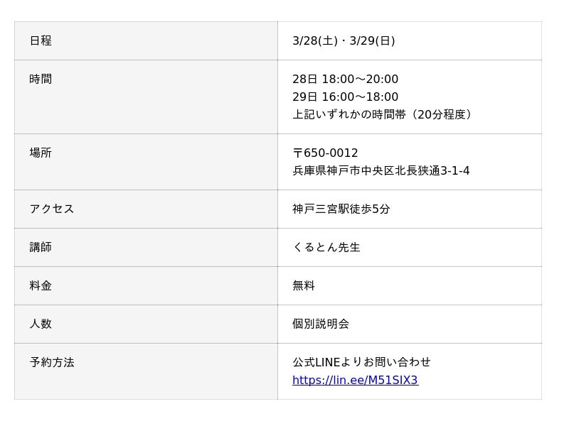 占い師養成CAMPの説明会と同時に、くるとん先生の対面鑑定も神戸で行います。すでにご予約いただきました方、誠にありがとうございます。くるとん先生が神戸で鑑定される貴重な機会になりますので、奮ってご参加ください。