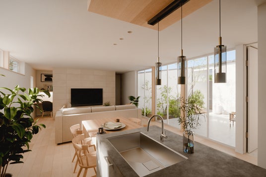 リビングには、中庭の屋根越しから緩やかな自然光が北側の壁面に反射して入り、北向き開口とは思えない心地よい明るさを生み出すことができる。