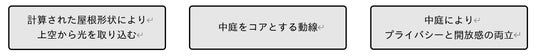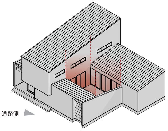 こうした条件の敷地において、「あえて南寄せスタイル」では、計算された屋根形状により上空から光を取り込み、中庭(アウターデッキ)を通じて室内に自然光を確保するプランをご提案します。