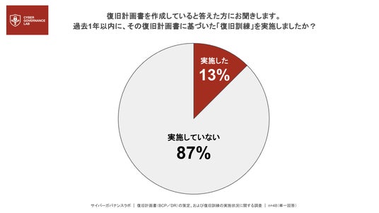 復旧計画書を策定している企業に対して、過去1年以内の復旧訓練の実施状況を尋ねたところ、実施したと回答した企業は13%にとどまり、82%が未実施という結果になりました。