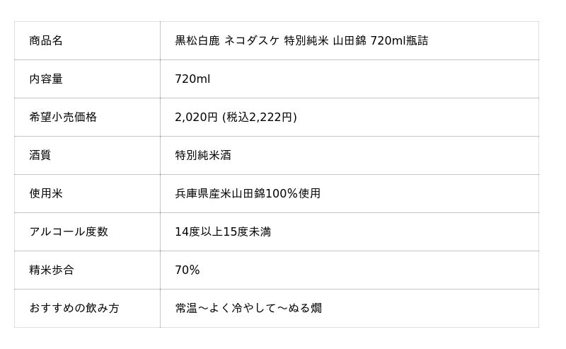 黒松白鹿 ネコダスケ 特別純米 山田錦 720ml瓶詰