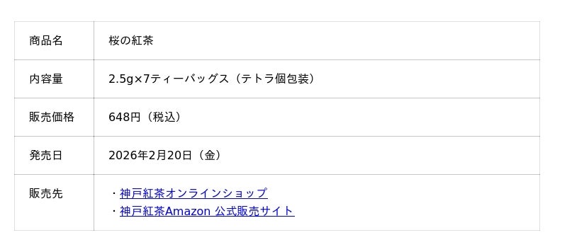 神戸紅茶株式会社(本社:兵庫県神戸市東灘区住吉浜町、社長:丸山 輝真)は、2026年2月20日(金)より、春のシーズナルティー「桜の紅茶」を神戸紅茶オンラインショップにて数量限定で販売を開始します。
