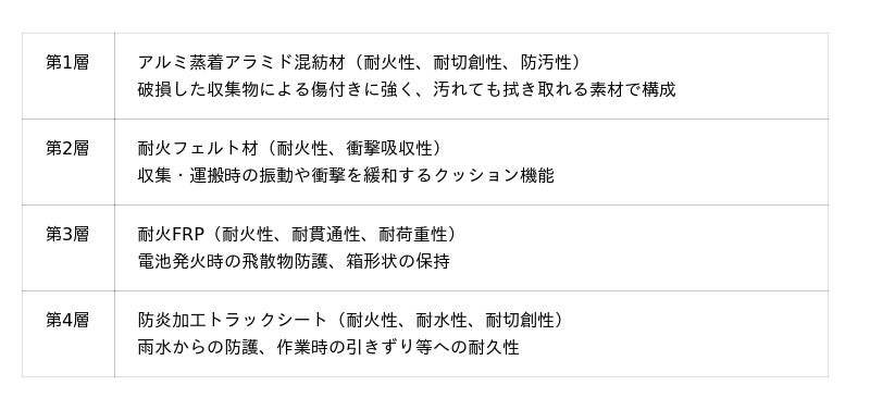 本製品は廃棄物収集を行う自治体および民間事業者を主な対象とし、機能に応じて配置した4層の防護素材で構成されたBOXで、発火リスクの高い使用済み二次電池や二次電池を内蔵した小型家電を安全に隔離・保管・搬送することを目的とした製品です。収集物を起因とする発火時の人的被害、収集車両、設備の損傷を抑制し、地域社会への影響の低減及び安定した事業継続(BCP)に貢献します。