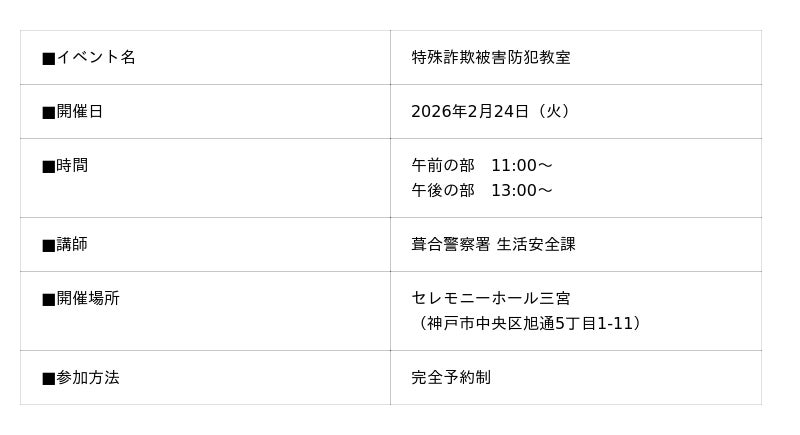株式会社ベルコ(本社大阪府池田市)は近年増加する還付金詐欺や金融機関を装った不正アクセス被害などの特殊詐欺から地域住民を守るため、「特殊詐欺被害防犯教室」を2026年2月24日(火)にセレモニーホール三宮にて開催いたします。