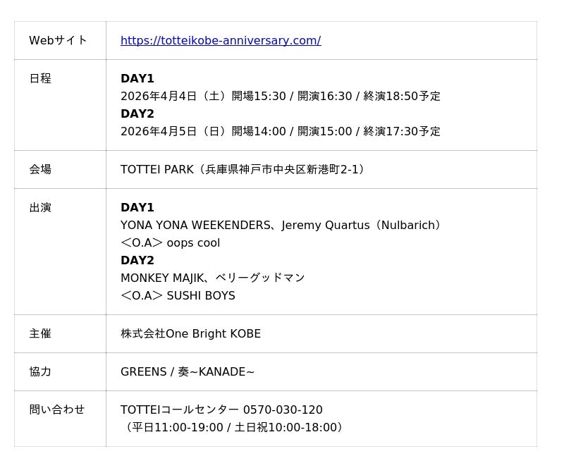 株式会社One Bright KOBE(住所:神戸市中央区、代表取締役社長 渋谷 順)は、『TOTTEI KOBE 開港祭 1st ANNIVERSARY』期間に開催される『TOTTEI PARK FESTIVAL 2026』のDAY2に、ベリーグッドマンとSUSHI BOYS(オープニングアクト)の追加出演が決まり、2日間の全出演アーティストが決定したことをお知らせします。また本日2月18日(水)12:00よりDAY2のチケットの追加先行販売を開始します。
