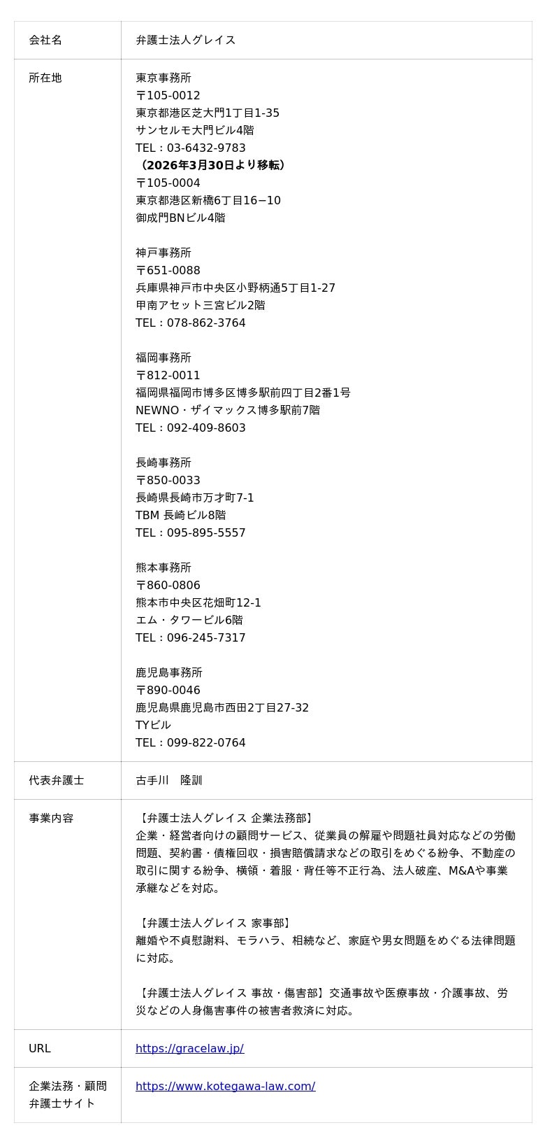 弁護士法人グレイスは、東京都を本拠地とし、鹿児島、神戸、福岡、熊本、長崎に拠点を展開する法律事務所です。750社以上の企業と顧問契約を締結しており、労働問題、契約書・債権回収・損害賠償請求などの取引をめぐる紛争や、不動産の取引に関する紛争、横領・着服・背任等不正行為、法人破産、M&Aや事業承継などを幅広く対応しております。