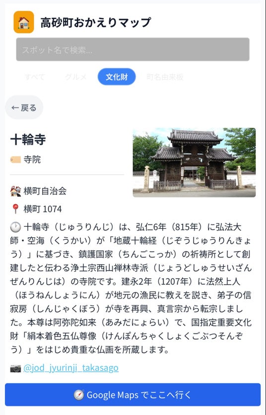 高砂町には、歴史的な町並み、文化財、商店街、地域店舗など、多様な地域資源が存在しています。一方で、既存の情報発信はテーマや媒体が分散しやすく、地域の現在の姿や日々の営みの中で育まれている魅力を、一体的に伝えにくいという課題がありました。また、紙媒体のみでは更新頻度や掲載情報量に限界があり、時間の経過とともに実態とのずれが生じやすい側面もあります。