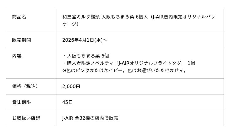 J-AIR全32機の機内にて2026年4月1日から順次販売開始します。また購入者限定のノベルティとして「J-AIRオリジナルフライトタグ」が付属します。