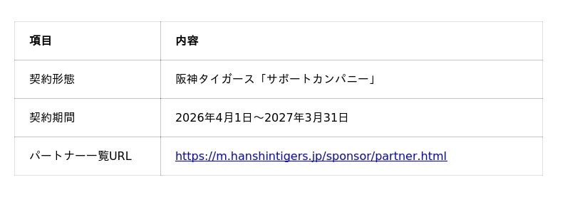 本契約により、当社は阪神タイガース公式サイトのスポンサー・パートナーページ(https://m.hanshintigers.jp/sponsor/partner.html)に、「サポートカンパニー」として2026年4月1日より掲載されます。球団公認のパートナーとして、より多くのファンと球団をつなぐ存在として活動してまいります。■ スポンサーシップ概要